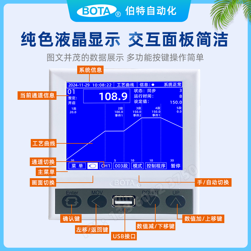 BT820/829、BT850/859多功能無紙記錄儀,采用智能PID調(diào)節(jié)、支持100段可編程、Modbus通訊、支持萬能輸入。可用于溫控、濕度、液位、流量、濕度等多種場(chǎng)景。多畫面數(shù)據(jù)內(nèi)容切換顯示:工藝曲線、實(shí)時(shí)曲線、綜合曲線、歷史曲線、報(bào)警停電記錄、棒狀圖及通道綜合信息等。可同時(shí)5路測(cè)量控制,另支持通道擴(kuò)展實(shí)現(xiàn)多路測(cè)量控制和報(bào)警輸出。支持萬能輸入,mA調(diào)節(jié)/變送、固態(tài)繼電器(SSR)、交流接觸器、可控硅過零觸發(fā)、可控硅移相觸發(fā)等。